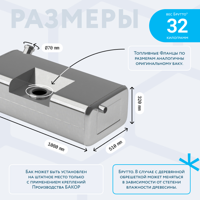 Бак соответствует размерам оригинала и может быть установлен на штатное место в качестве основного с применением оригинальных креплений. С родного бака можно будет переставить топливозаборник. Бак оснащен заливной горловиной с самозапираемым непроливаемым клапаном и полуоборотной заглушкой. Внизу бака имеется сливное отверстие с болтом на медной шайбе.
