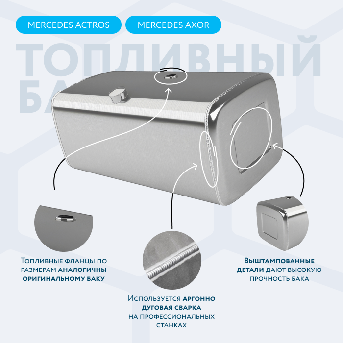 Алюминиевый бак не подвержен коррозии, что делает его более долговечным, а так же сбережет вашу топливную систему. Бак из алюминия в два раза легче стального бака, хотя он и изготовлен из листа увеличенной толщины в 2,5 мм. В конструкции предусмотрены цельные перегородки, которые проварены по периметру. Баки из алюминия так же оснащены заливной горловиной с самозапираемым непроливаемым клапаном (который становится барьером для разлива топлива, а так же становится защитой от попадания мусора в бак при открытой крышке) . Кроме того, однозначно что алюминиевый бак выглядит намного привлекательнее и дороже - где бак в том числе становиться и элементом тюнинга автомобиля. На алюминиеввые баки действует увеличенная гарантия - 36 месяцев.